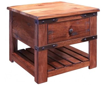 Wrought iron belts accents on legs custom cast iron pulls on drawers and solid wood slats on bottom shelves add to the rustic elegance of this occasional table collection.
