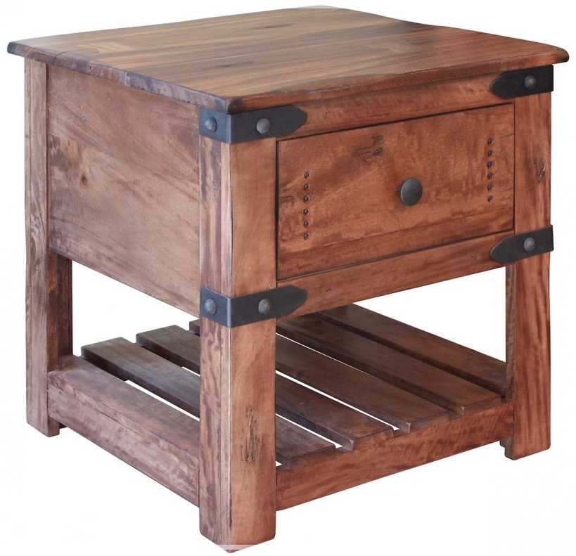 Wrought iron belts accents on legs custom cast iron pulls on drawers and solid wood slats on bottom shelves add to the rustic elegance of this occasional table collection.