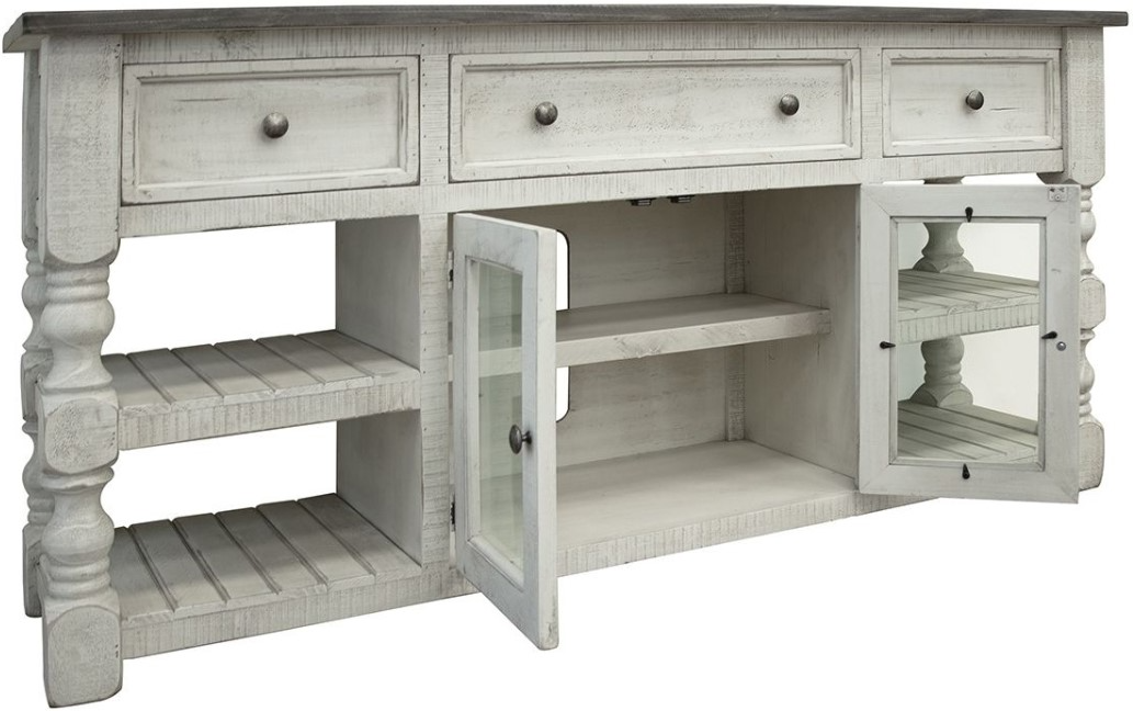 Two tone, multi-step lacquer finish. Tops feature weathered gray finish on hand-distressed wood. Eggshell antiqued finish on the rest of the case pieces.