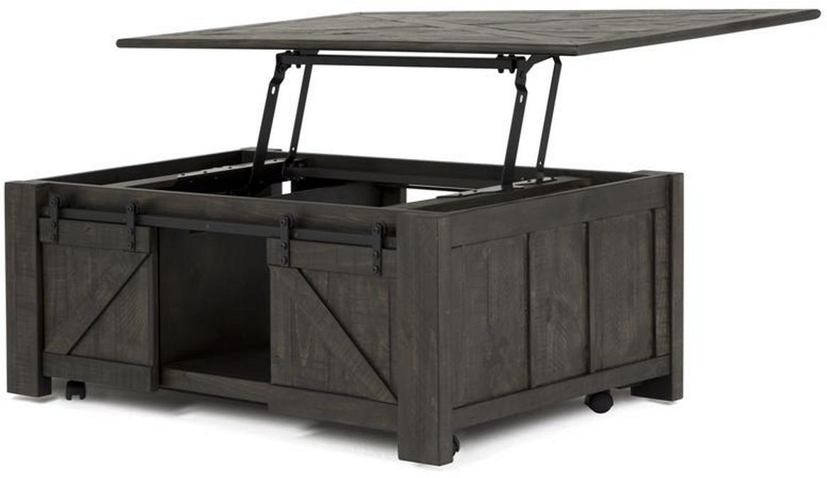 Designer-inspired Weathered Charcoal is the rustically sophisticated finish for the Garrett table collection. The rectangular lift-top cocktail table features sliding board and batten doors offset by metal hardware, a lift-top for functional ease, and casters for this charming cottage treasure.Read More