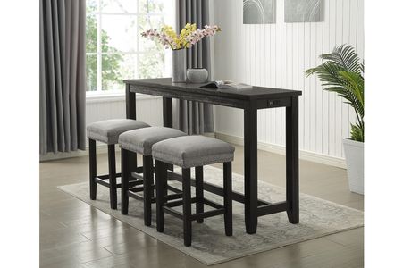 Perfect for small spaces this bistro set includes a counter height table and three stools that tuck in neatly when not in use. Constructed in pine veneers with a black finish. The chairs are upholstered in a linen look gray fabric. The table boasts integrated USB outlets and an A/C power outlet that makes it a great piece to double as a desk.Read More